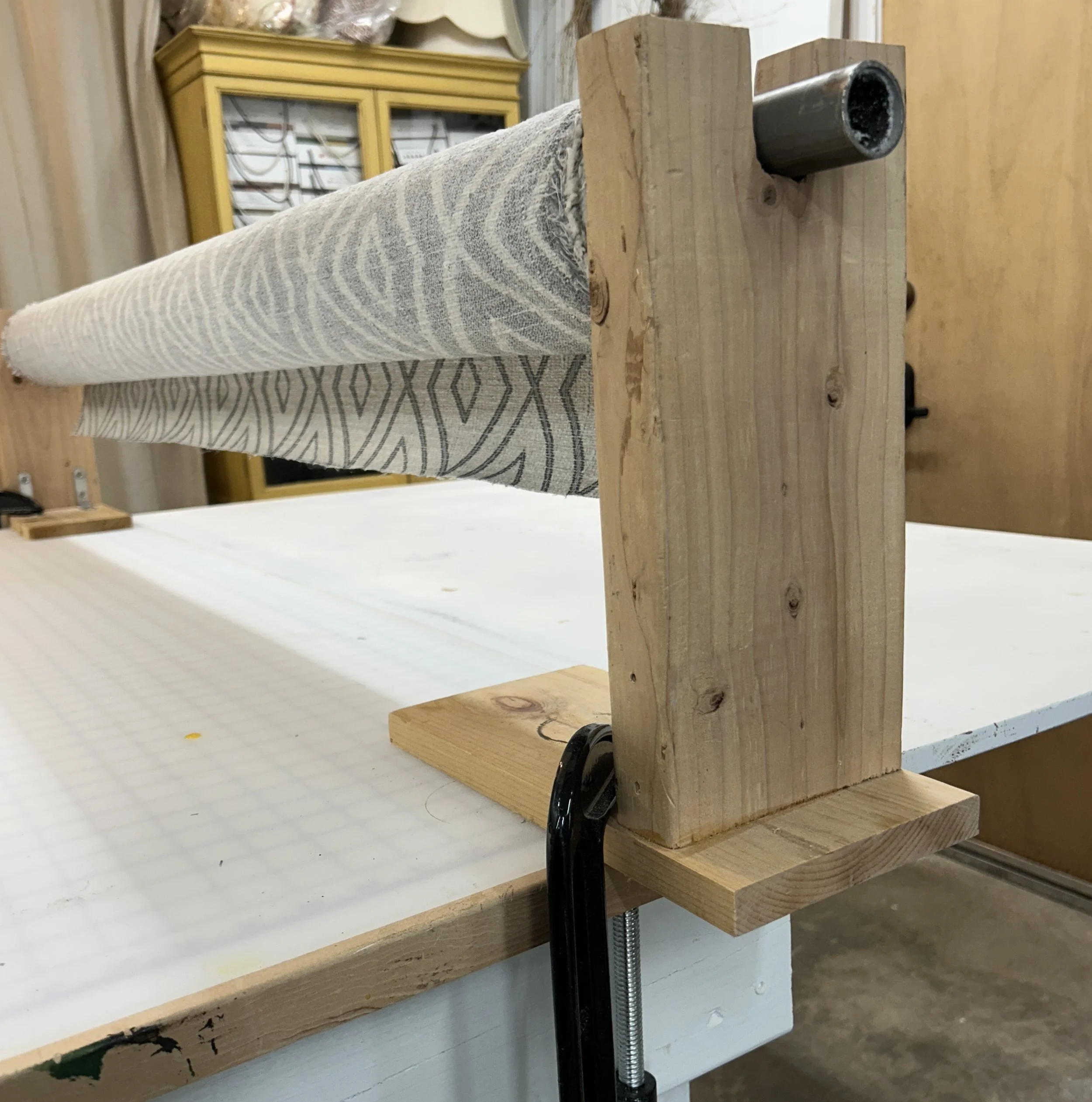 Cutting, inspecting and rolling out fabric is so much easier when the roll is supported properly. Especially when you are handling a lot of yardage. These DIY removable holders attach directly to my worktable, letting fabric unroll smoothly without wrinkling or touching the floor. When I’m done cutting, they come off and the table goes back to normal. Perfect for a workroom where every surface has to earn its keep.
